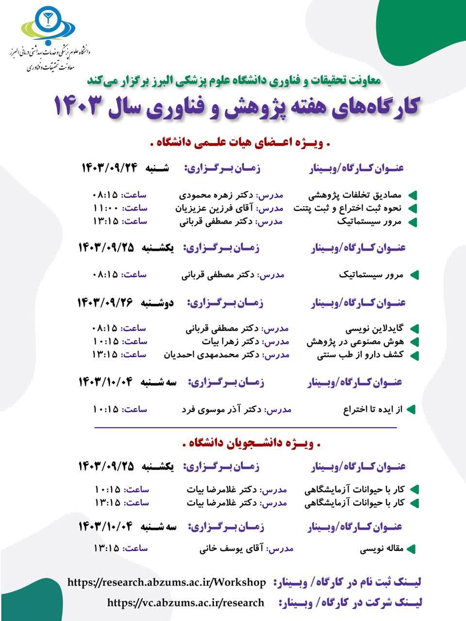تاریخ و زمان برگزاری کارگاه های هفته پژوهش در دانشگاه علوم پزشکی البرز اعلام شد گروه خبری : اخبار,اطلاعیه,اخبار و مطالب مهم ,مطالب علمی و پژوهشی,توسعه تحقیقات کد خبر : 337384 کلمات کلیدی
