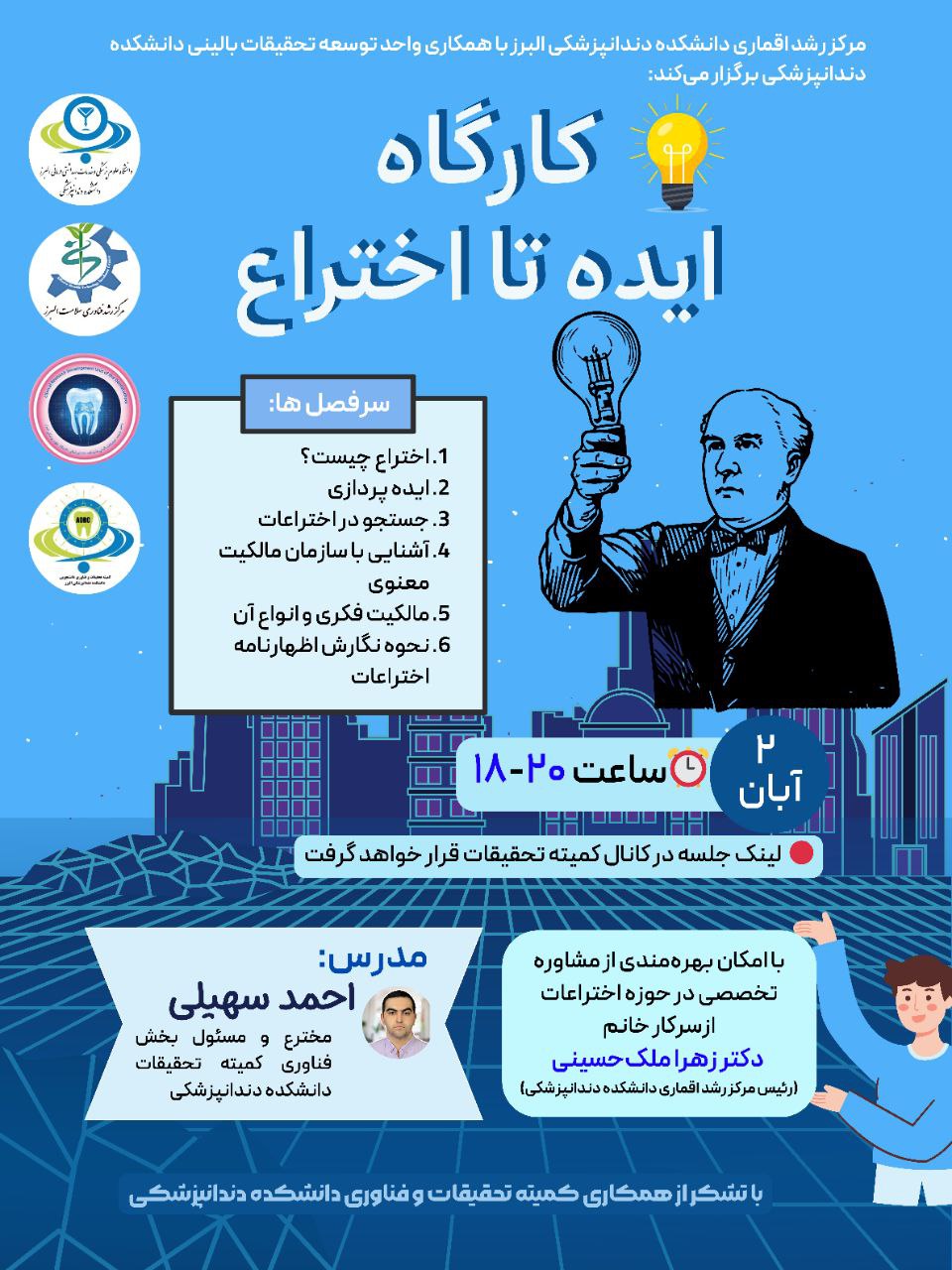 مرکز رشد اقماری دانشکده دندانپزشکی البرز، با همکاری واحد توسعه تحقیقات بالینی و کمیته تحقیقات دانشکده دندانپزشکی برگزار می کند.«کارگاه ایده تا اختراع »سرفصل ها:اختراع چیست؟ایدهپردازی جستجو در اختراعات آشنایی با سایت مالکیت معنوی مالکیت فکری اختراعات نحوه نگارش اظهارنامه اختراعات با امکان بهرهمندی از مشاوره تخصصی حوزه اختراعات و ایده پردازی توسط: خانم دکتر زهرا ملک حسینی(رییس مرکز رشد اقماری دانشکده دندانپزشکی)مدرس:احمد سهیلی (مخترع و مسئول بخش فناوری و اختراعات کمیته تحقیقات دانشجویی دانشکده دندانپزشکی)تاریخ برگزاری: چهارشنبه ۲ آبان، ساعت ۱۸ الی ۲۰